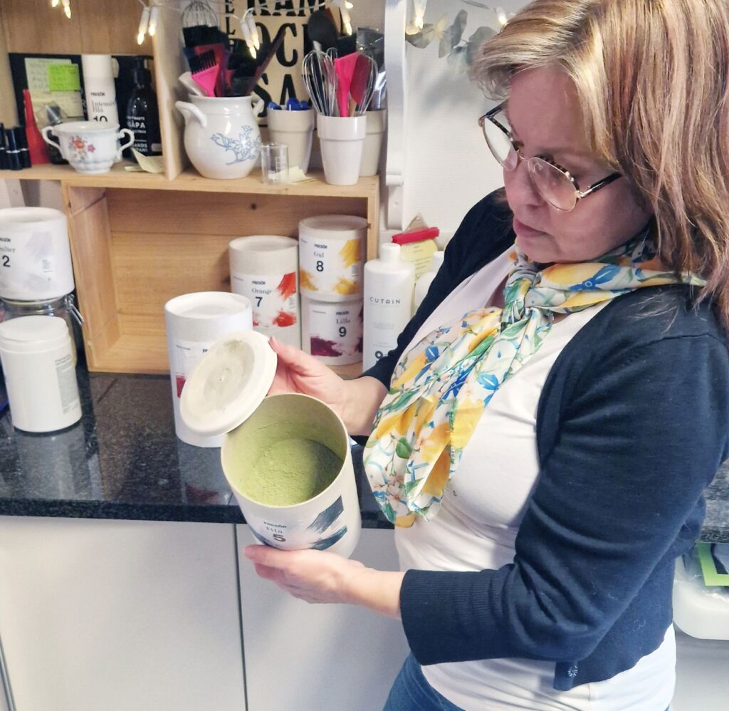 Helena Nilsson använder bara växtfärger, inga kemikalier, vid hårfärgning.